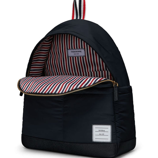 Black appliqué logo two-way zip fastening single flat top handle two padded adjustable shoulder straps front patch pocket two side slit pockets main compartment striped lining internal logo tag multipocket backpack