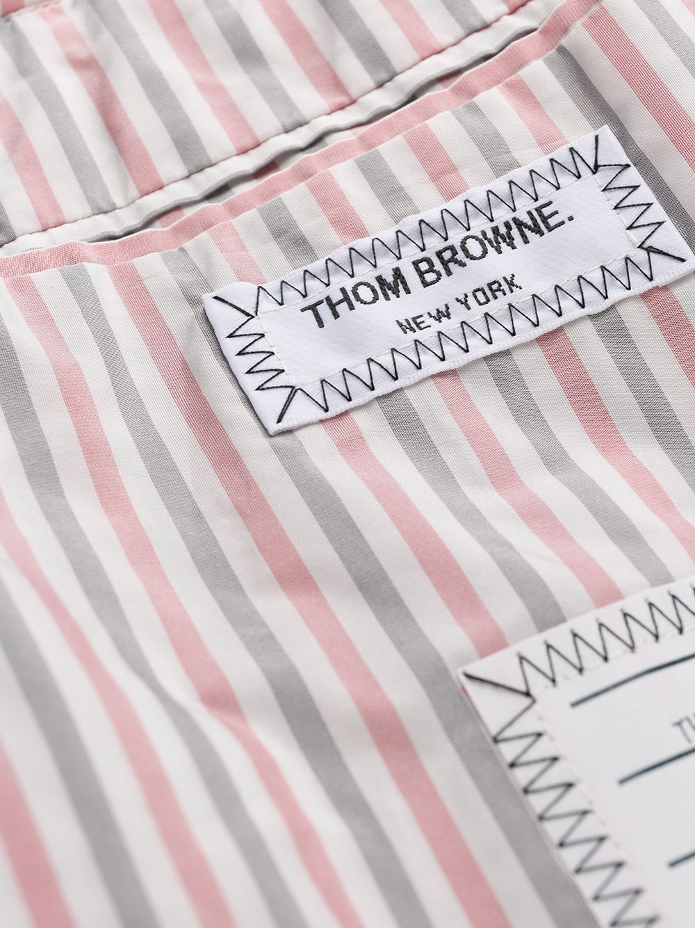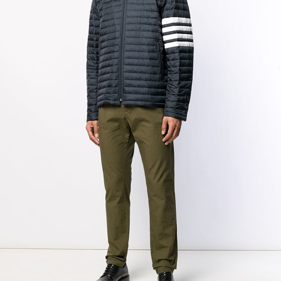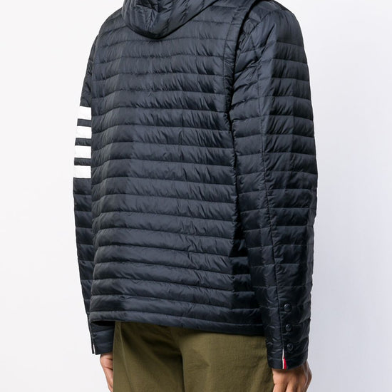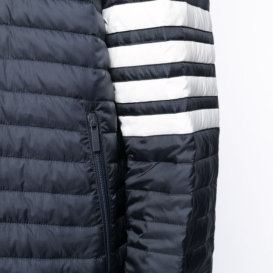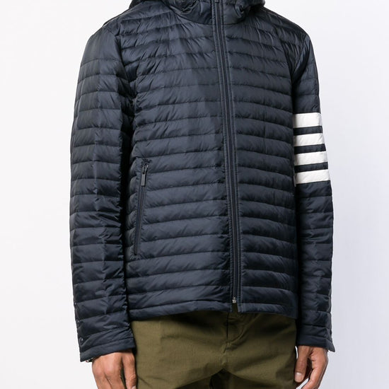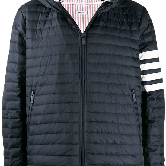 Are you 'down' for looking good? then you'll want to get your hands on this feather-down jacket from thom browne. the signature 4-bar stripe draws the eye. featuring a hood, a front zip fastening, long sleeves, button cuffs, front zipped pockets, front zipped pockets, a printed lining and a 4-bar stripe. 4bar nylon down jacket size and fit - chest: 116.0 centimetres. sleeve length: 66.0 centimetres. length: 66.0 centimetres. waist: 118.0 centimetres.