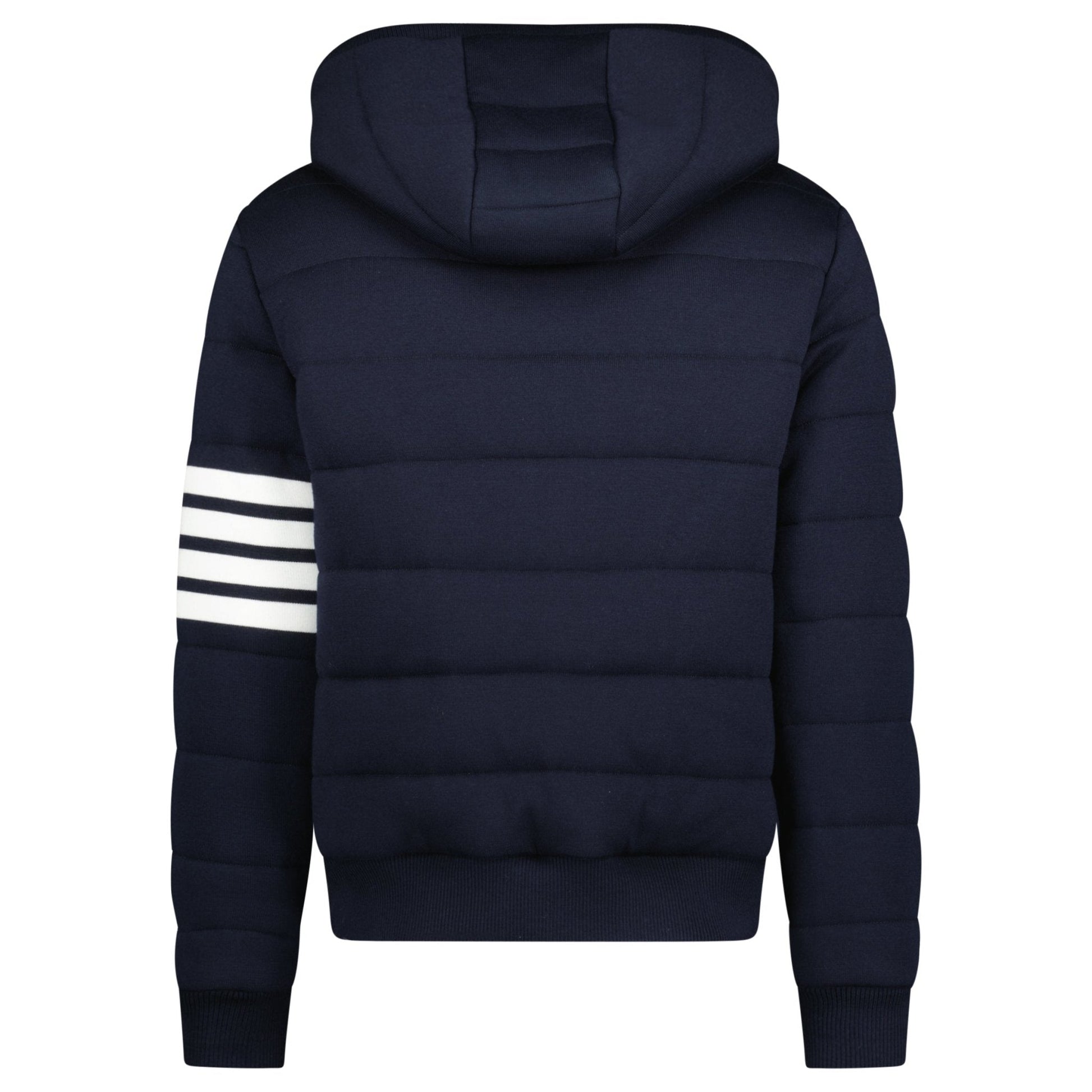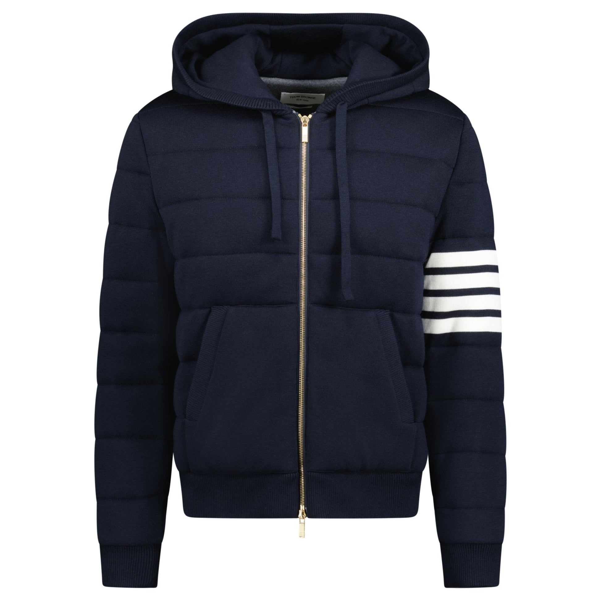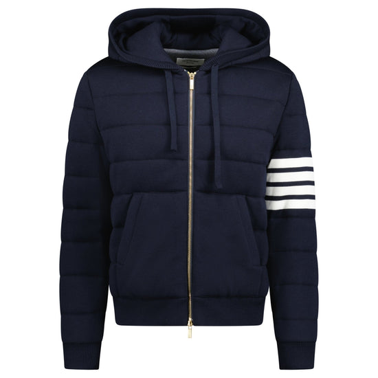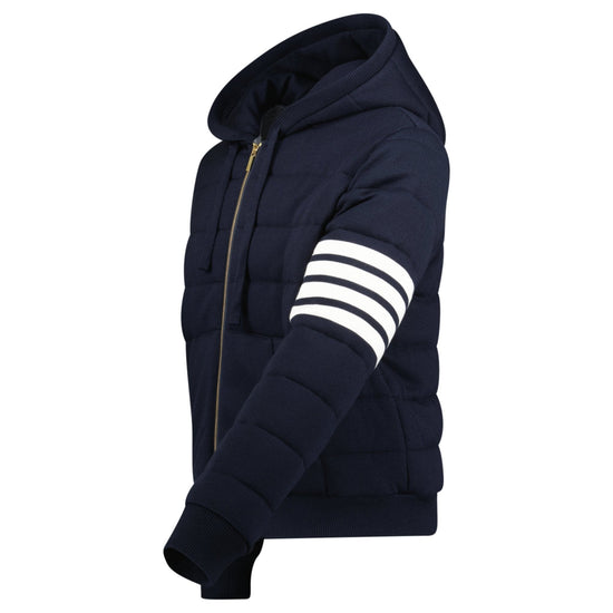 shop the thom browne merino wool jersey stitch padded 4-bar zip-up hoodie in navy at boinclo. crafted from 100% virgin wool, this premium hoodie blends luxury with comfort. featuring the iconic 4-bar detailing and a convenient zip-up closure, it’s perfect for elevating your casual wardrobe. the drawstring hood and side slip pockets add practicality to this refined leisurewear piece. made in italy, this hoodie embodies thom browne’s signature style and craftsmanship.