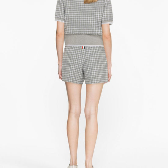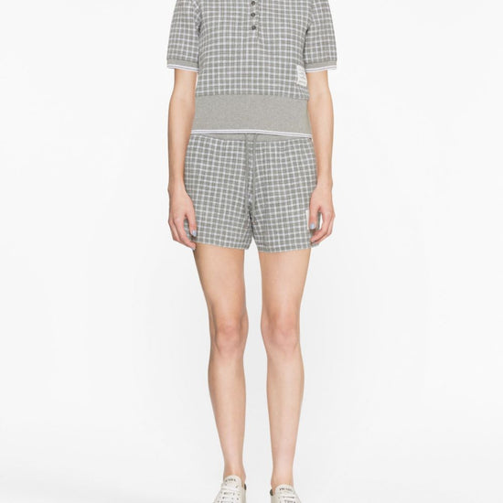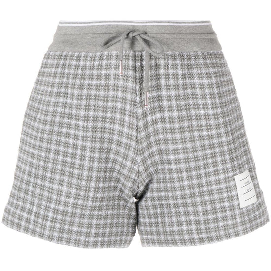 Checked tweed track shorts from thom browne featuring light grey, off-white, cotton, check print, logo patch to the front, elasticated drawstring waistband and two side slit pockets. tweed cotton shorts size and fit - this piece fits true to size. we recommend you get your regular size. model is 1,75m / 5ft 8in wearing size 40 (it)