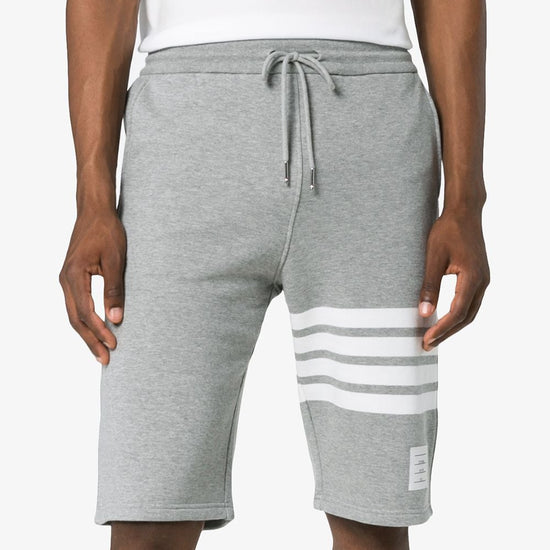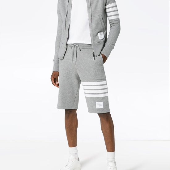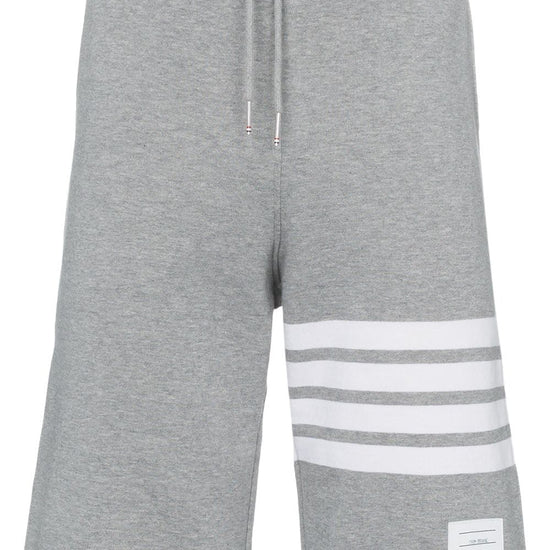 4-bar jersey shorts from thom browne featuring cool grey, cotton, jersey knit, grosgrain ribbon trim, signature 4-bar stripe and elasticated drawstring waistband. 4bar cotton sweatpants size and fit - this piece fits true to size. we recommend you get your regular size. model is 1,84m / 6ft 1in wearing size 2 (num)