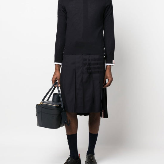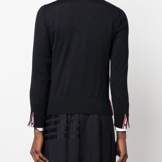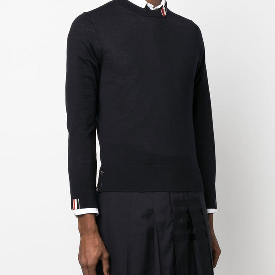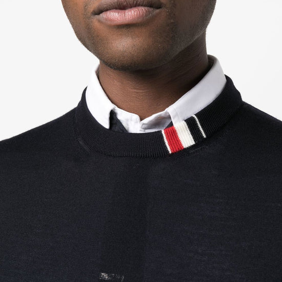 Jersey stitch crew neck jumper from thom browne featuring navy blue, virgin wool blend, fine knit, ribbed-knit edge, rwb stripe, crew neck, long sleeves and straight hem. rwb ricamato collo wool crewneck jumper size and fit - this piece fits true to size. we recommend you get your regular size. model is 1,84m / 6ft 1in wearing size 2 (num)