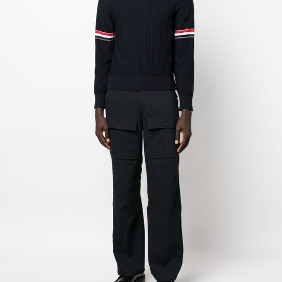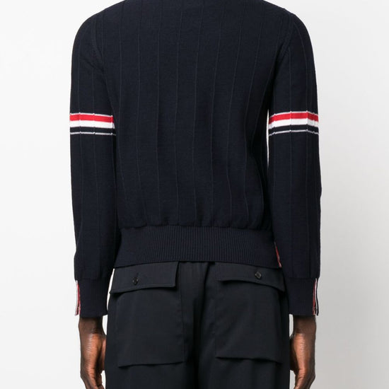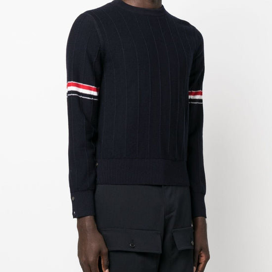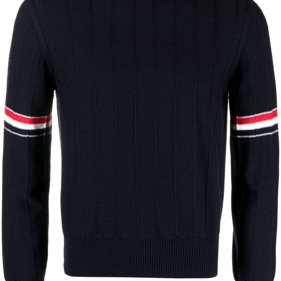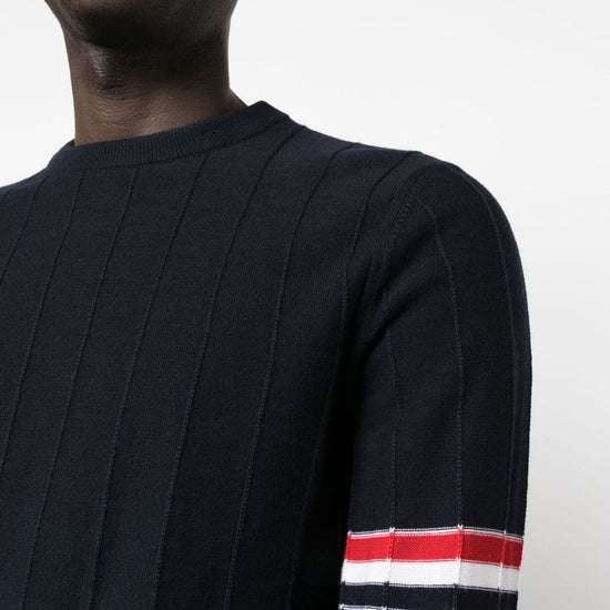 Rwb-stripe long-sleeve jumper from thom browne featuring navy blue, virgin wool, rwb stripe, round neck and long sleeves. rwb wool crewneck jumper size and fit - this piece fits true to size. we recommend you get your regular size. model is 1,84m / 6ft 1in wearing size 2 (num)