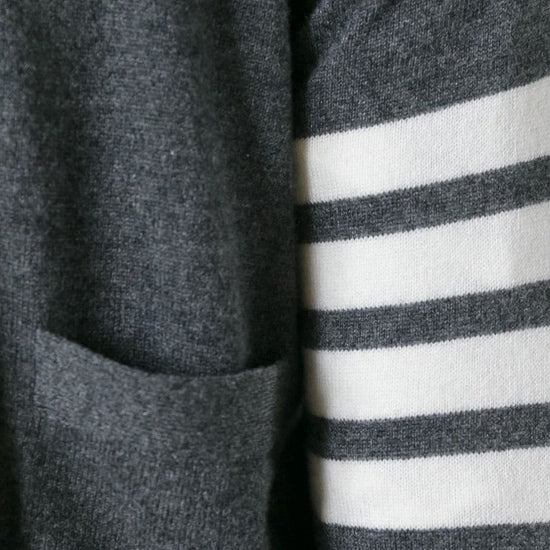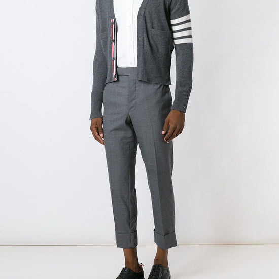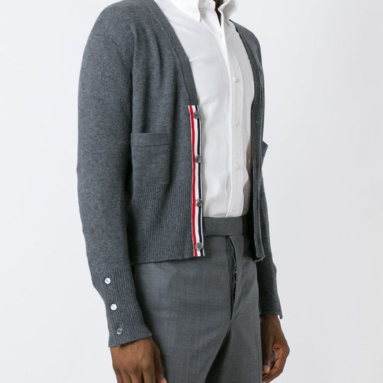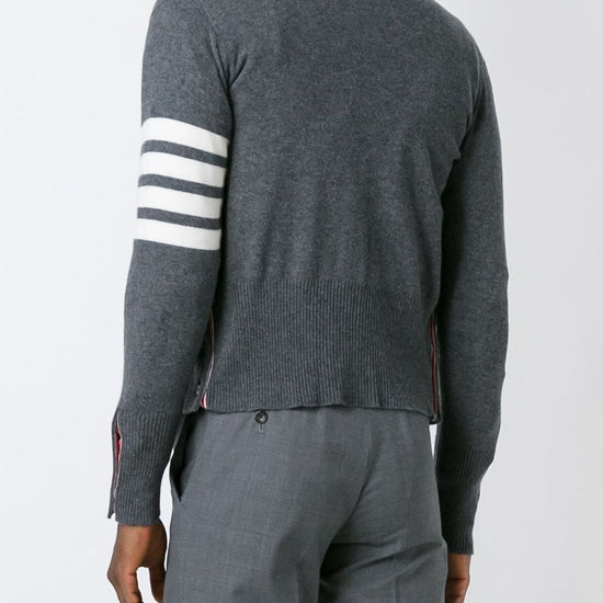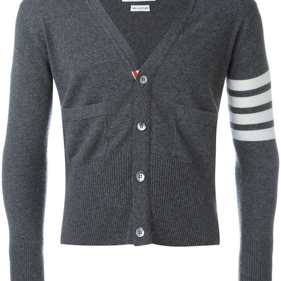 4-bar cashmere cardigan from thom browne featuring medium grey, cashmere, knitted construction, ribbed trim, signature 4-bar stripe, grosgrain ribbon trim, v-neck, two front patch pockets, long sleeves, front button fastening and straight hem. 4bar cashmere cardigan size and fit - this piece fits true to size. we recommend you get your regular size. model is 1,84m / 6ft 1in wearing size 2 (num)
