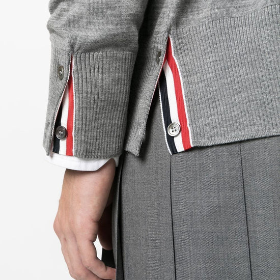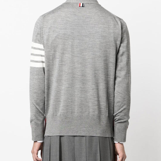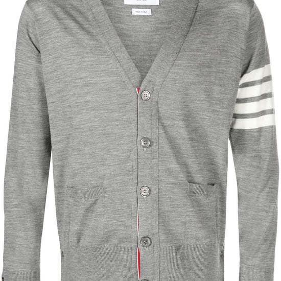 Grey/white virgin wool knitted construction signature 4-bar stripe signature grosgrain loop tab v-neck front button fastening long sleeves buttoned cuffs 4bar wool cardigan