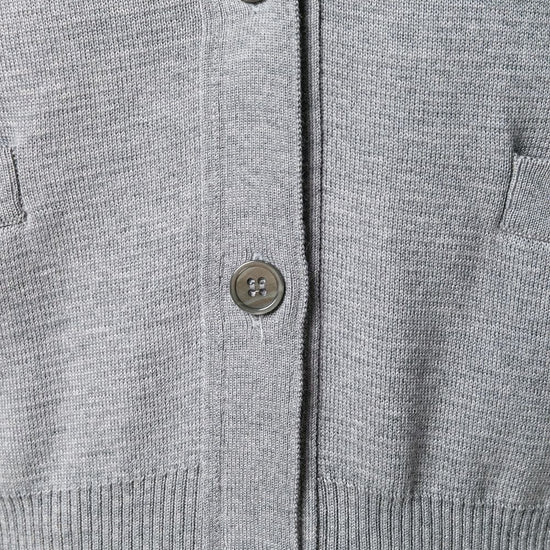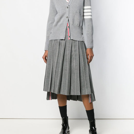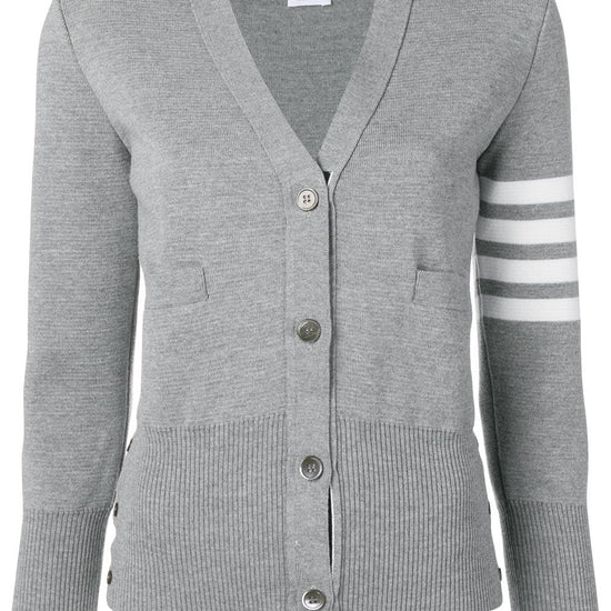 Light grey wool 4-bar milano stitch cardigan from thom browne featuring signature 4-bar stripe, v-neck, long sleeves, buttoned cuffs, front button fastening, side button fastening, ribbed edge, two front pockets, signature tricolour tab to the back, signature tricolour grosgrain trim and milano stitching. wool cardigan