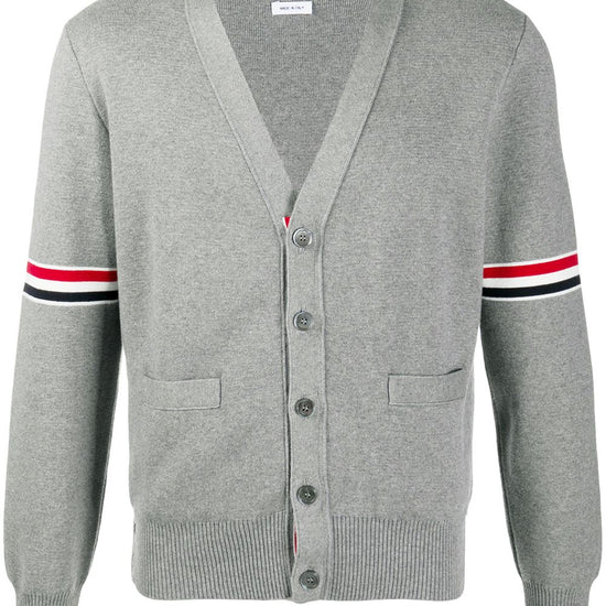 Light grey cotton milano stitch stripe armband cardigan from thom browne featuring front button fastening, two front patch pockets, signature 4-bar stripe, signature 4-bar tab, long sleeves, buttoned cuffs, side button fastening and ribbed detailing. rwb cotton cardigan size and fit - this piece fits true to size. we recommend you get your regular size. model is 1,84m / 6ft 1in wearing size 2 (num)