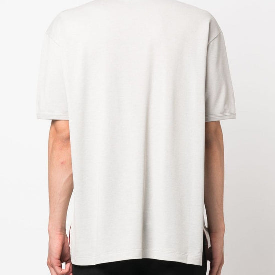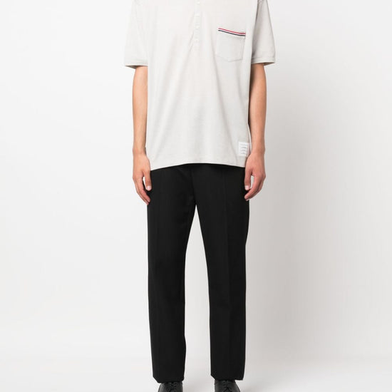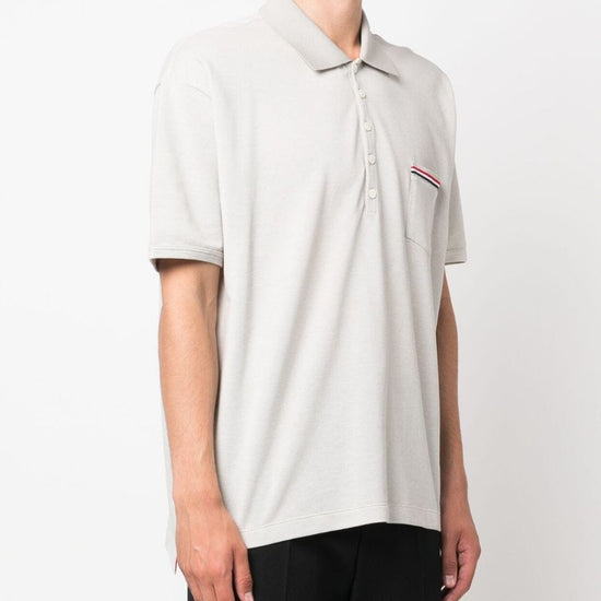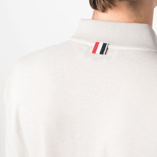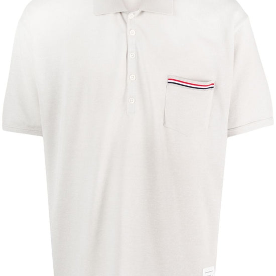 Cotton polo shirt from thom browne featuring ecru, polo collar, front button placket, chest patch pocket, short sleeves, signature grosgrain loop tab, straight hem and cotton. rwb taschino oversized cotton polo shirt size and fit - this piece fits true to size. we recommend you get your regular size. model is 1,84m / 6ft 1in wearing size 2 (num)