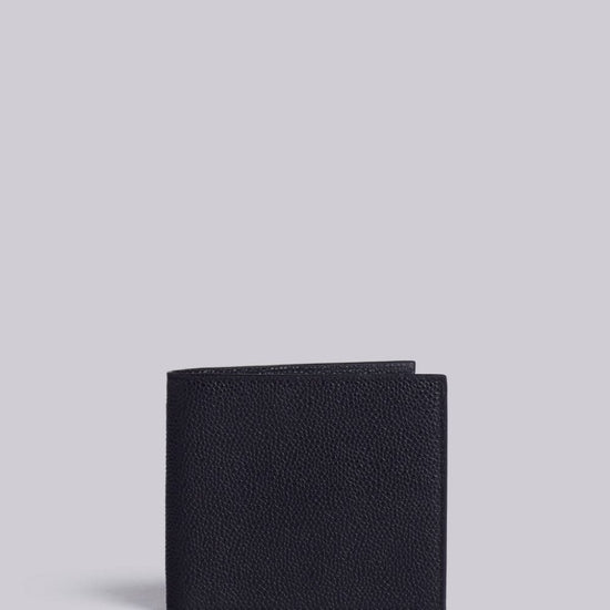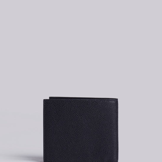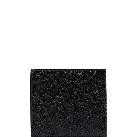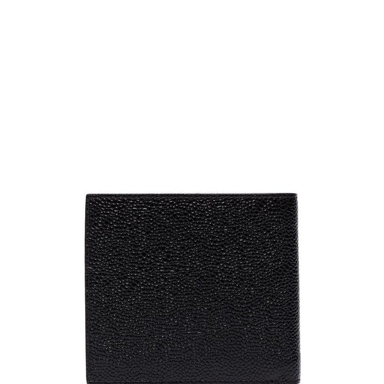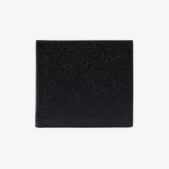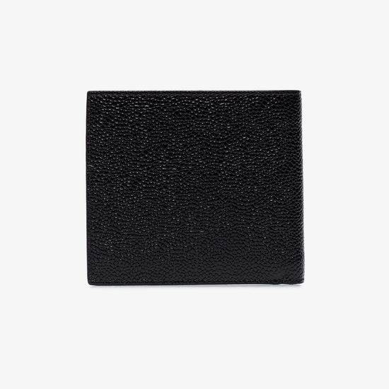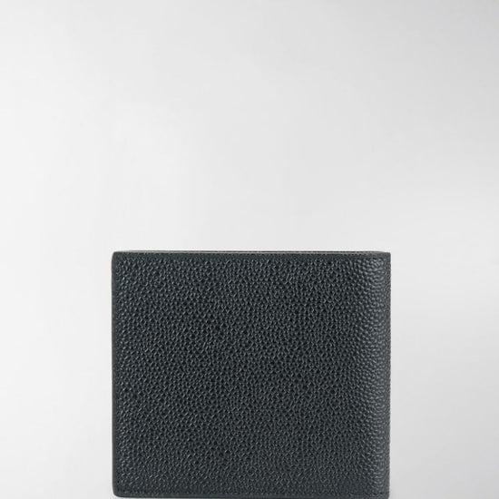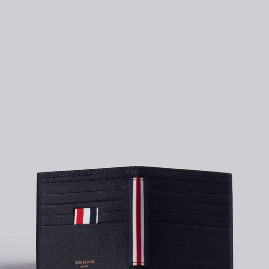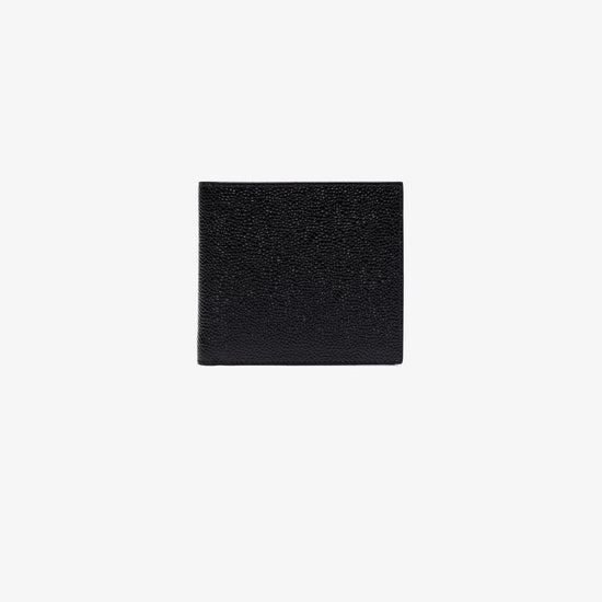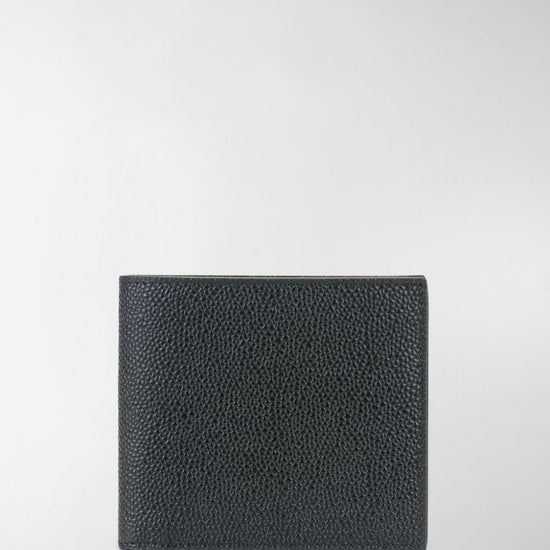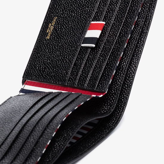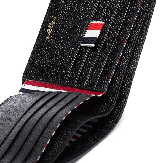 Black leather grained texture rwb stripe grosgrain ribbon trim internal logo stamp bi-fold design internal card slots note compartment leather bifold wallet