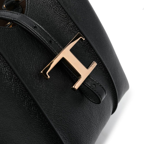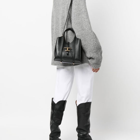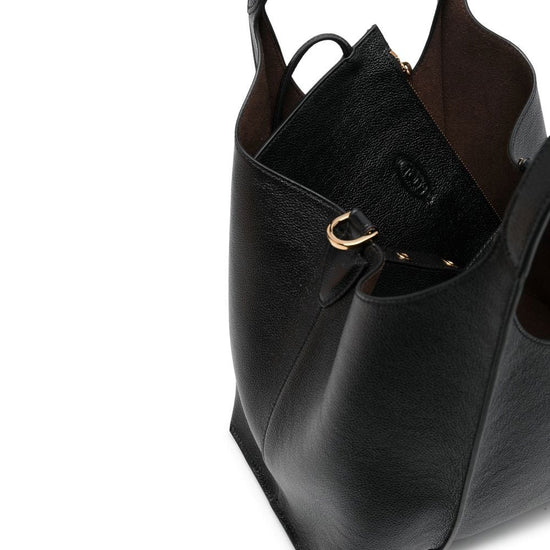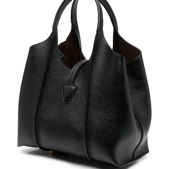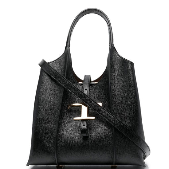 Black calf leather pebbled texture gold-tone logo plaque trapeze silhouette two rounded top handles adjustable detachable shoulder strap mini leather shopping bag