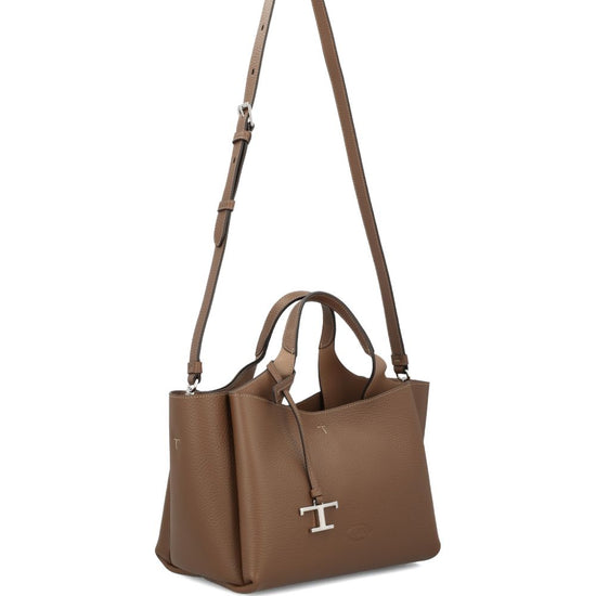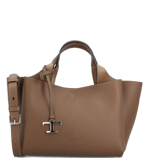 Brown silver-tone hardware top handles detachable shoulder strap t-logo charm grained leather mini leather tote bag