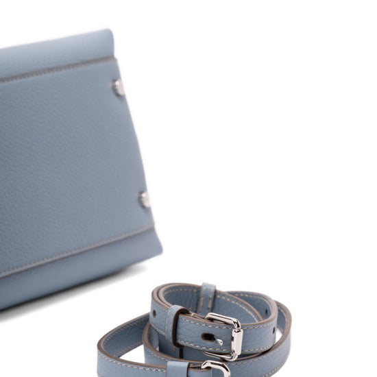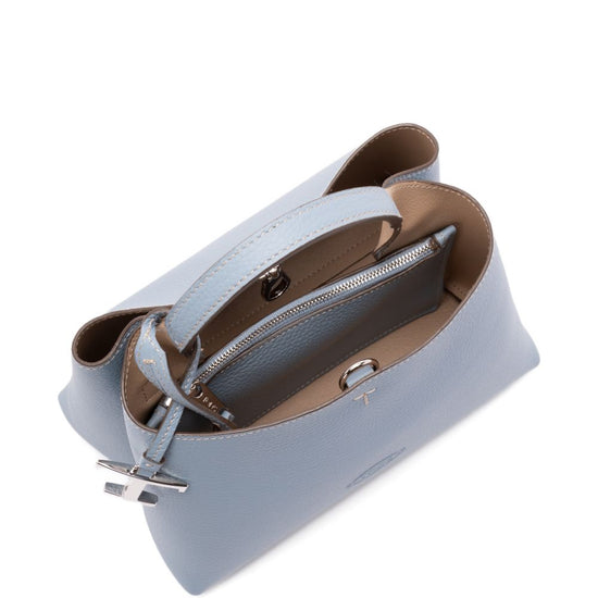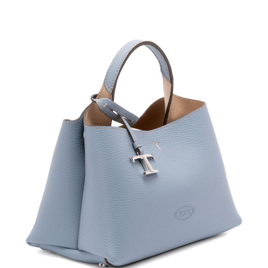 Faded blue leather top handle detachable and adjustable strap embossed logo 't' charm leather micro tote bag
