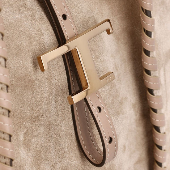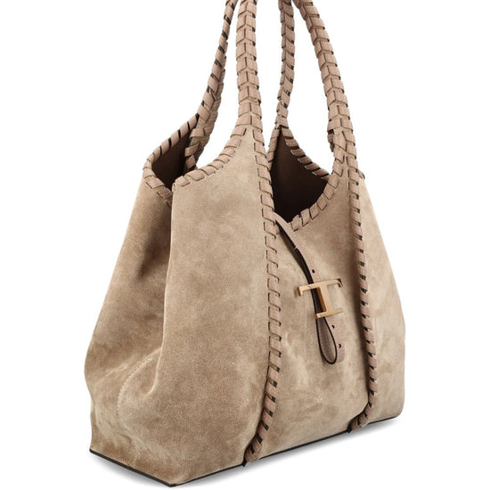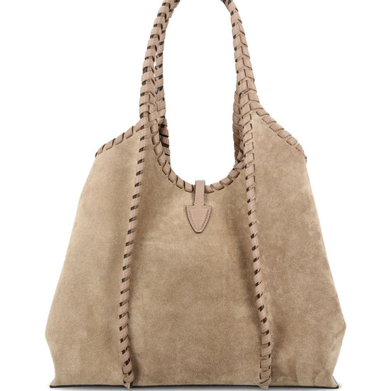 Mocha beige braided trim gold-tone logo plaque two top handles foldover press-stud fastening main compartment medium leather tote bag