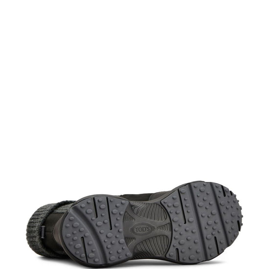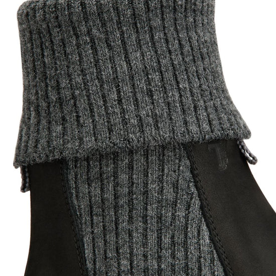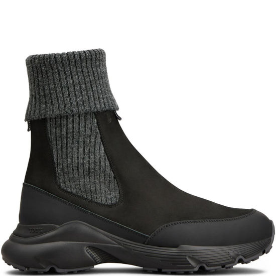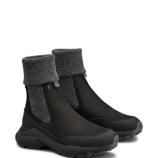Black slip-on style elasticated side panels round toe chunky rubber sole leather knitted boots