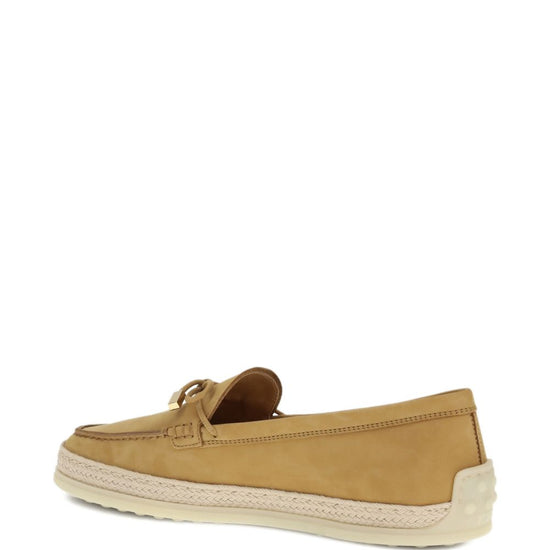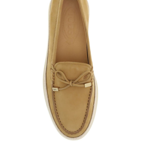 Beige raffia trim bow detail raised seam rubber sole suede leather loafers