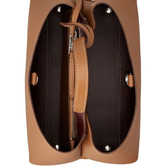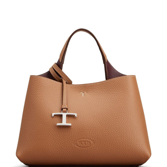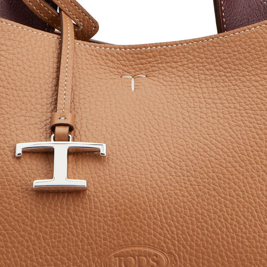 Camel brown leather grained texture debossed logo to the front logo pendant hook fastening adjustable detachable shoulder strap single top handle partitioned compartment internal zip-fastening pocket metal feet micro leather shopping bag