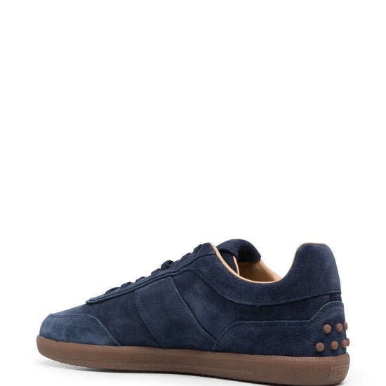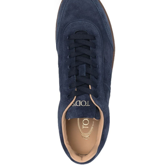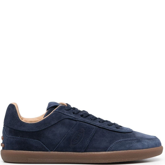 Navy blue leather/suede panelled design round toe front lace-up fastening logo-print tongue debossed logo to the side pebbled texture branded insole flat rubber sole tabs suede leather sneakers size and fit - heel: 2.0 centimetres. sole height: 1.0 centimetres.