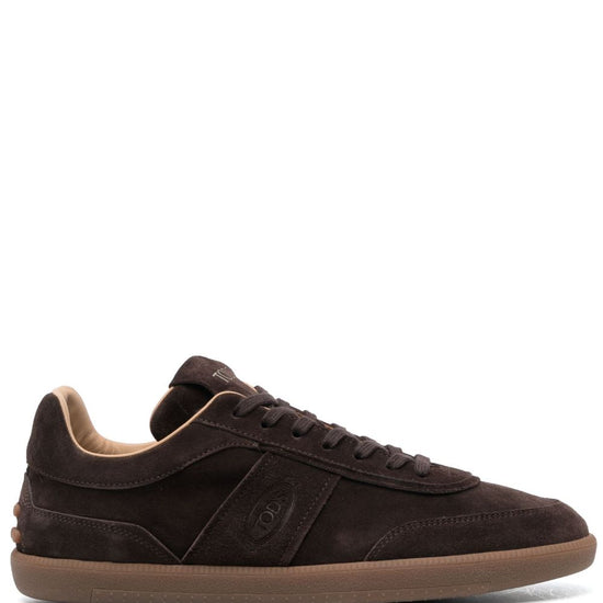 Brown calf suede logo-print tongue round toe front lace-up fastening flat rubber sole tabs suede leather sneakers size and fit - heel: 2.0 centimetres. sole height: 1.0 centimetres.
