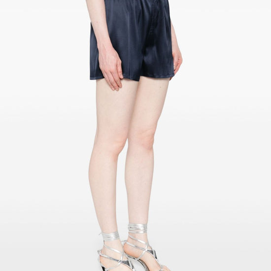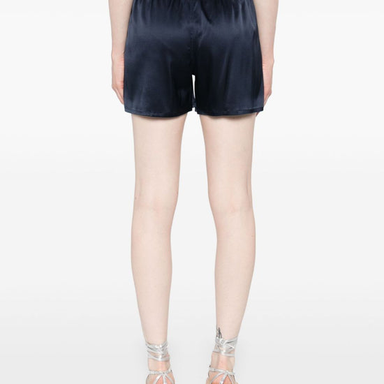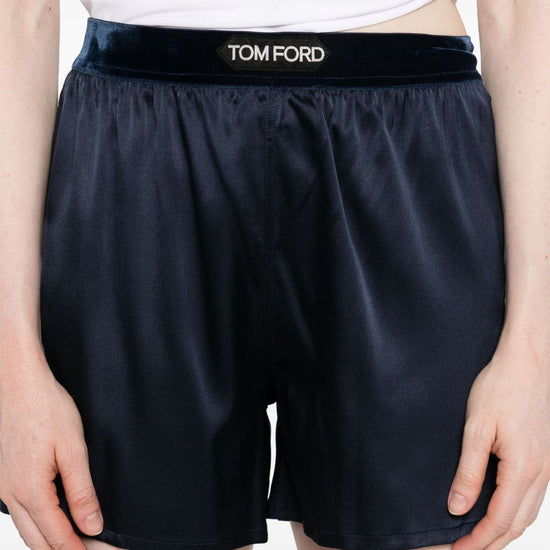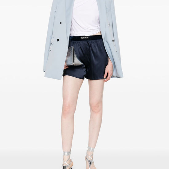 Navy blue elasticated waistband logo waistband silk shorts size and fit - this piece fits true to size. we recommend you get your regular size. model is 1,75m / 5ft 8in wearing size s