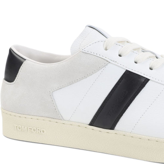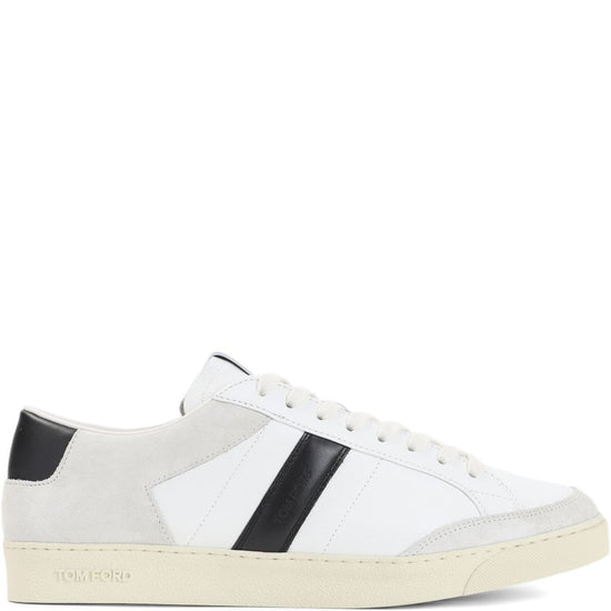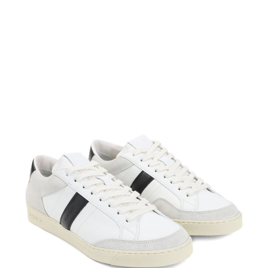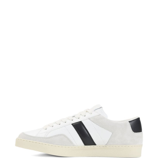 White cream stripe panelled design lace-up fastening round toe leather sneakers