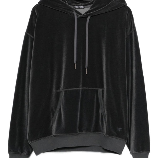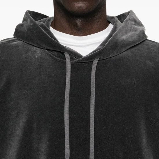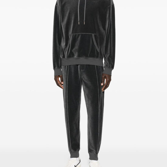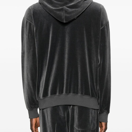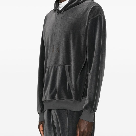 Dark grey drawstring hood pouch pocket ribbed trims velour hoodie