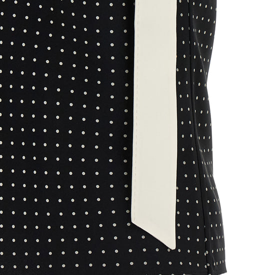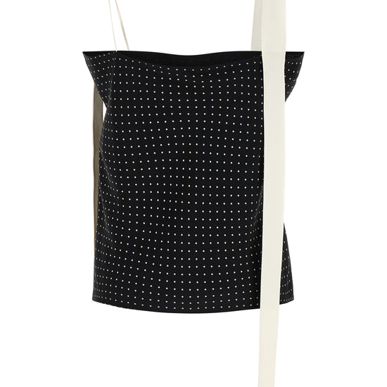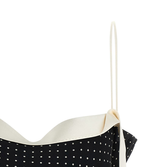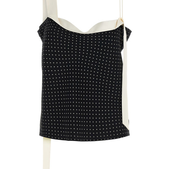 Polka dot patterned silk crêpe top, thin straps with contrast satin tuxedo band detail that runs down the body, square neckline. size and fit - true to size fit