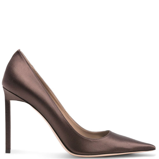 Coffee brown pointed toe high stiletto heel branded insole betty satin pumps size and fit - heel 3,9 in / 10 cm.
