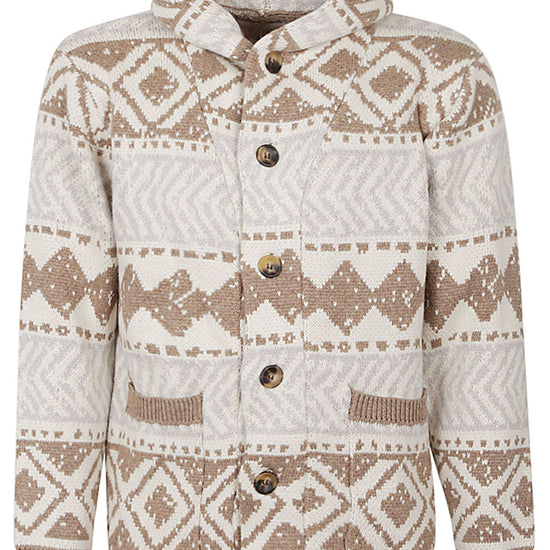 Beige cardigan, with navajo fantasy, large, shawl, long sleeves with descent shoulder, front closure with buttons, two applied pockets, with coast edges. c/cappuccio, stampa perù ethnic print cardigan size and fit - this piece fits true to size. we recommend you get your regular size. model is 1,84m / 6ft 1in wearing size m