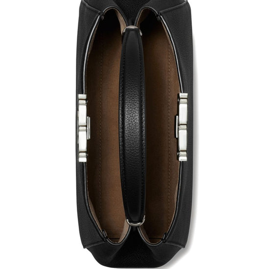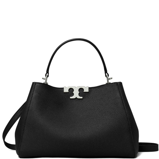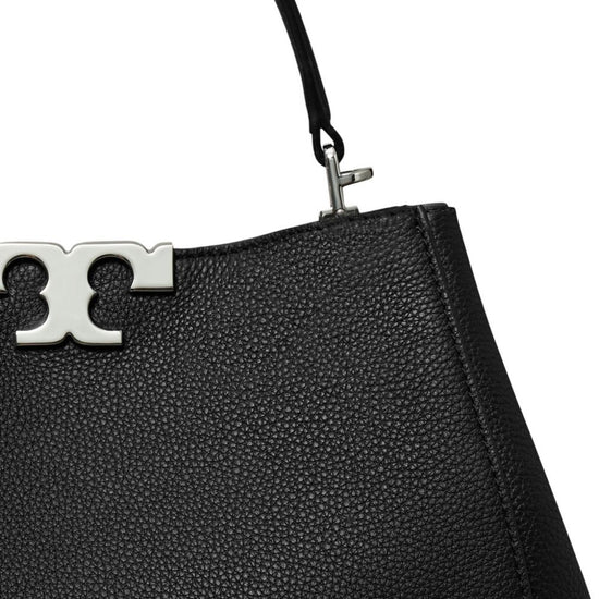 Black, leather, top handle, detachable shoulder strap, silver-tone hardware, logo detail, magnetic closure. eleanor medium leather satchel bag size and fit - depth 11 cm. height 18 cm. width 27 cm. strap 56.5 cm.