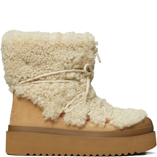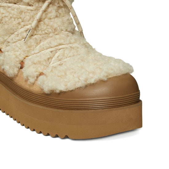 Beige shearling texture lace-up fastening platform sole ridged sole round toe mellow shearling boots