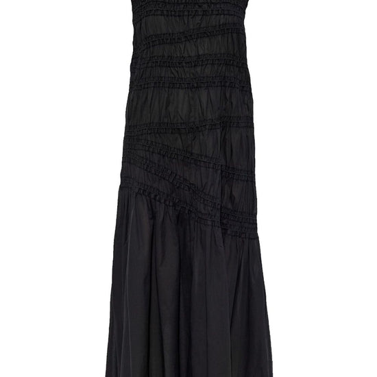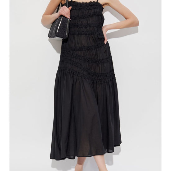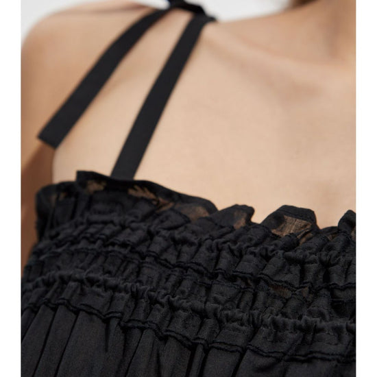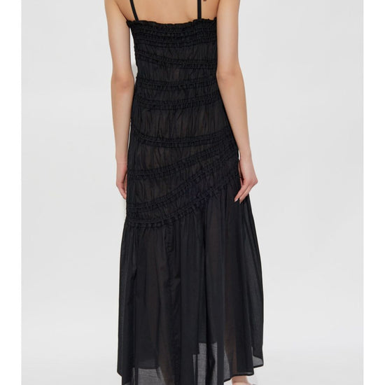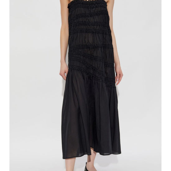 Black, cotton, pleated details, ruched details, thin straps, flared hem and mid-calf height. long cotton dress size and fit - this piece fits true to size. we recommend you get your regular size. model is 1,75m / 5ft 8in wearing size s