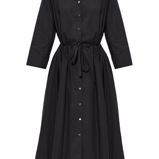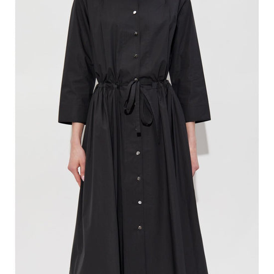 Black, cotton, model with belt, front buttoning closure, stand-up collar, 3/4 sleeves, straight hem and medium length. cotton shirt dress size and fit - this piece fits true to size. we recommend you get your regular size. model is 1,75m / 5ft 8in wearing size 4 (us)