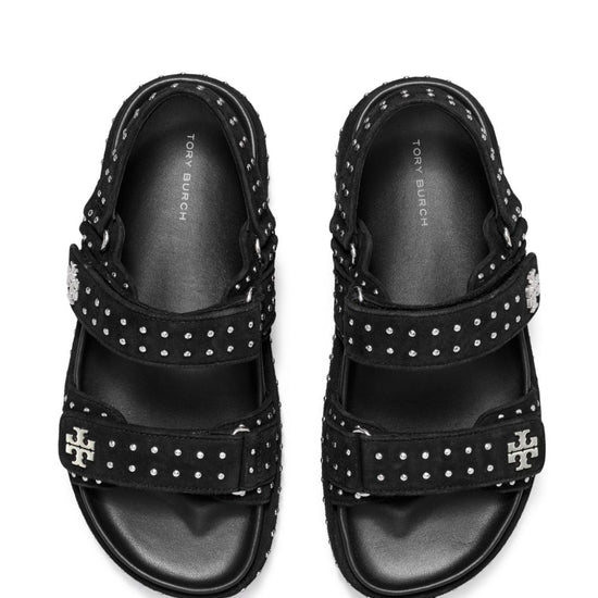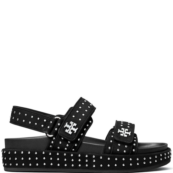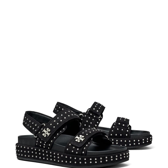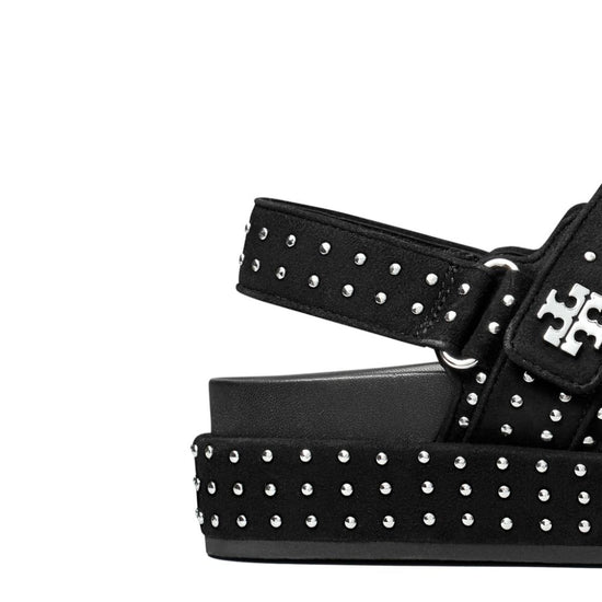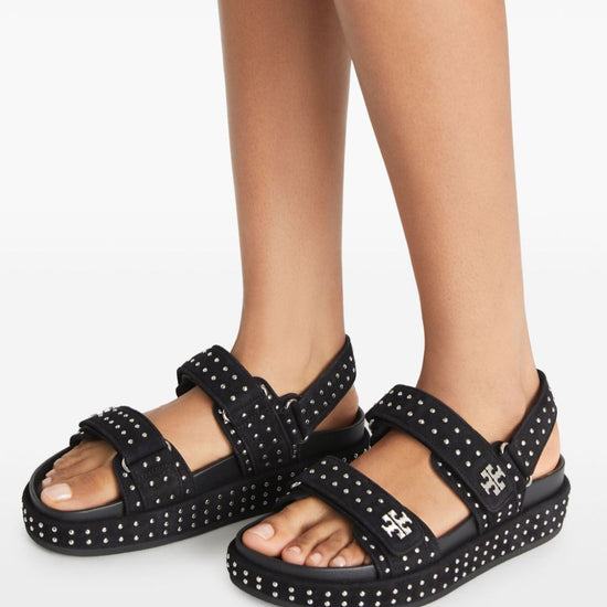 Black, nappa leather, studded detail, hook and loop front closure, signature double t motif, double strap design, open round toe, leather insole with logo and platform. kira studded sandals size and fit - heel 1,2 in / 3 cm; platform 0,8 in / 2 cm