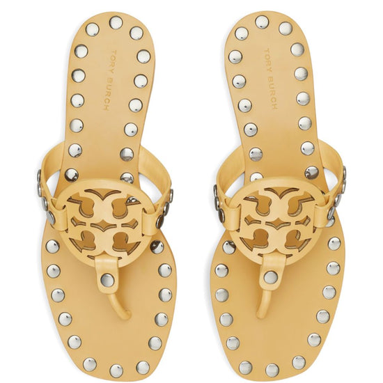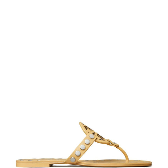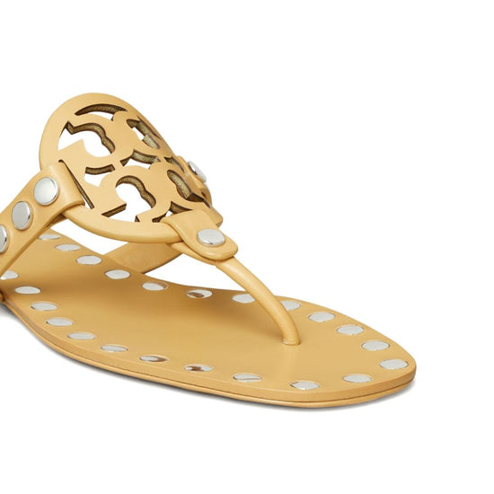 Cantucci yellow leather upper metal studs cut-out detail t-bar strap flat sole studded miller leather flat sandals