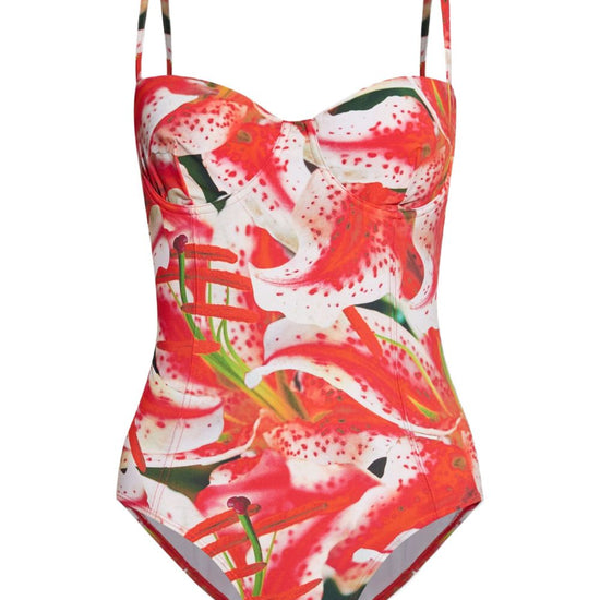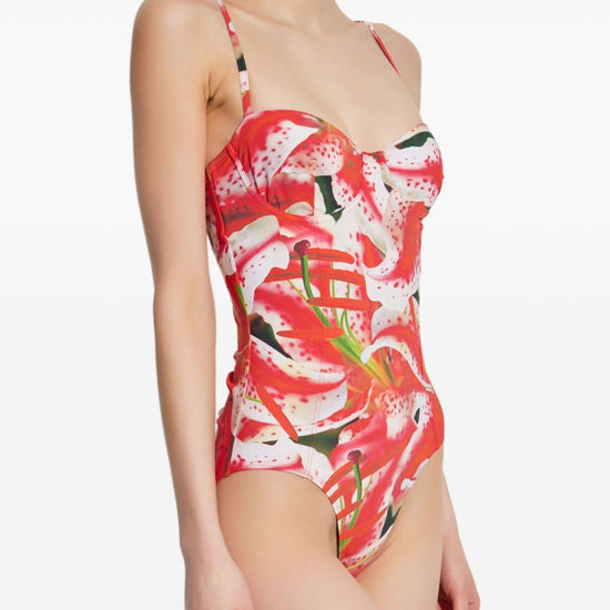 be mindful to try on swimwear over your own garments. printed swimsuit