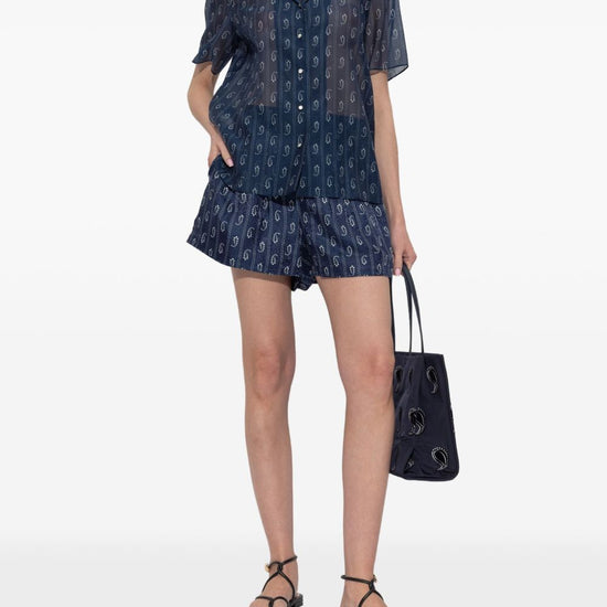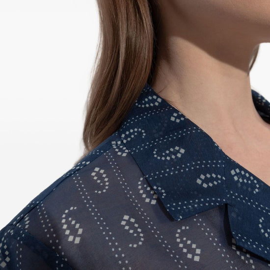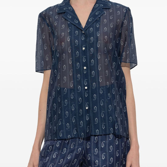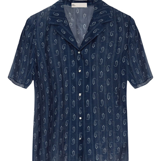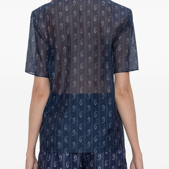 Dark blue paisley print button fastening short sleeves camp collar straight hem cotton and silk blend shirt