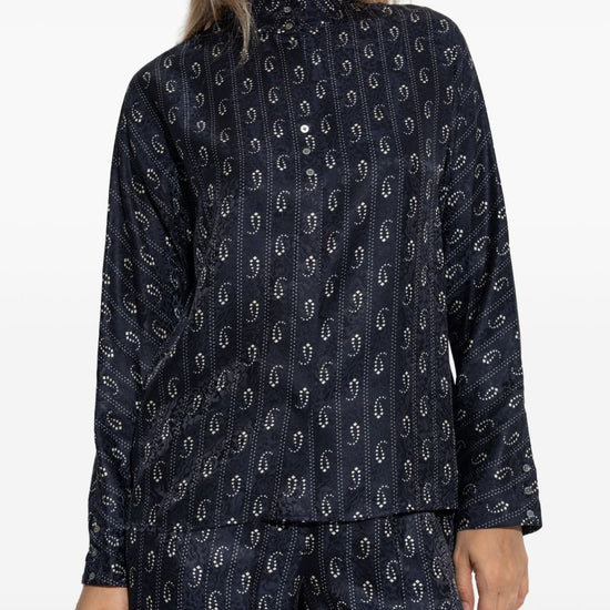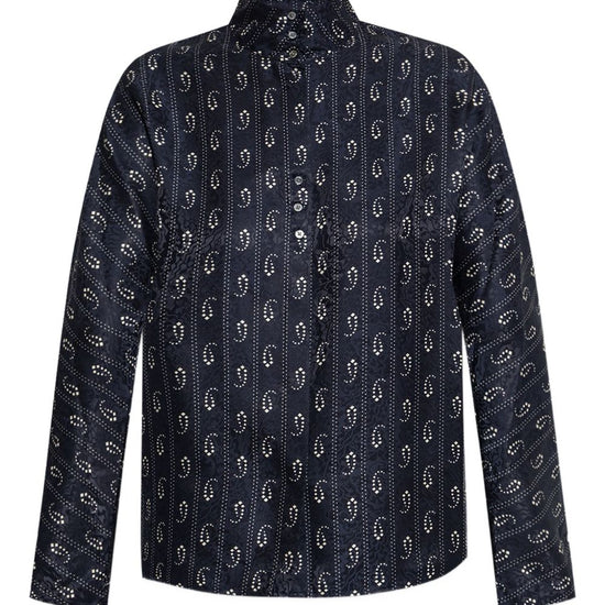Navy blue paisley print button fastening mandarin collar long sleeves jacquard silk shirt size and fit - this piece fits true to size. we recommend you get your regular size. model is 1,75m / 5ft 8in wearing size 4 (us)