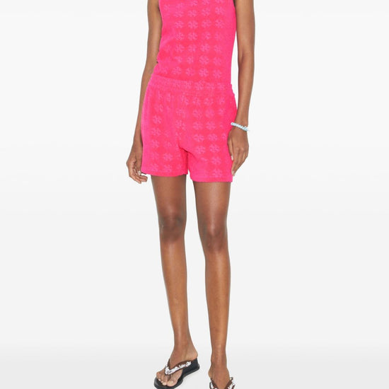 Bright pink all-over pattern elasticated waistband side pockets raw edge hem logo cotton shorts