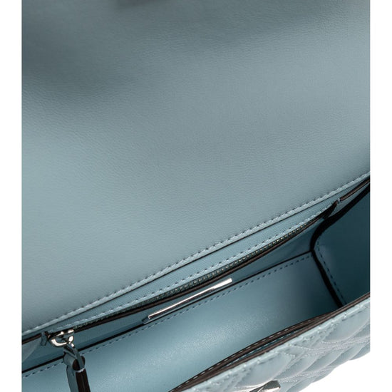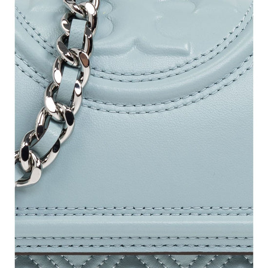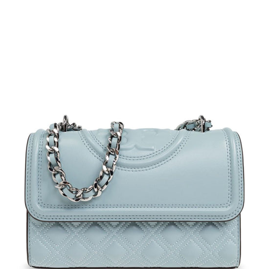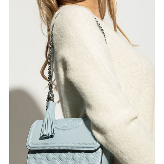 Light blue, lambskin, flap at the top with magnetic closure, chain shoulder strap, embossed logo at the front, tassel detail, single compartment, internal logo plaque and internal zip pocket. fleming small leather shoulder bag size and fit - width 8,27 in / 21 cm