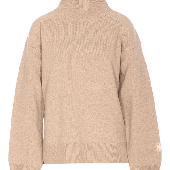 Beige embroidered logo high neck long sleeves wool turtle-neck jumper