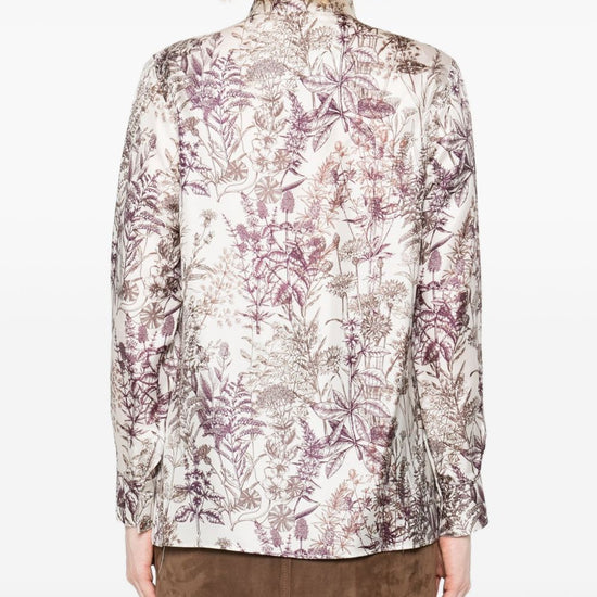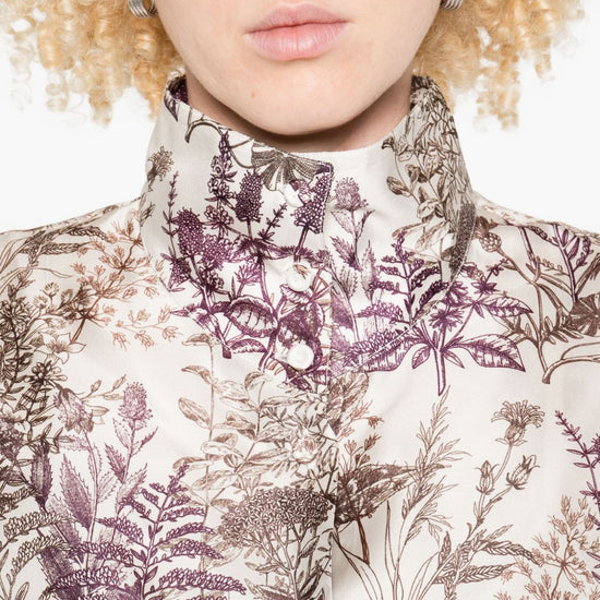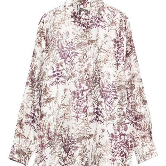 White silk floral print long sleeves button fastening high neck printed silk shirt