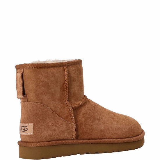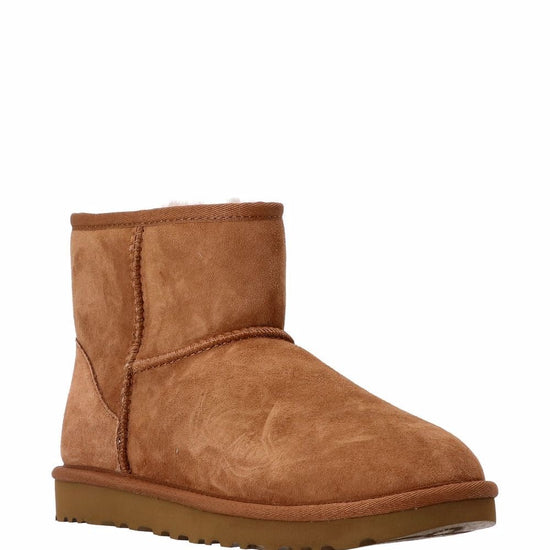 Brown sheepskin shearling lining logo patch to the rear ankle-length slip-on style round toe flat rubber sole classic mini ii boots size and fit - heel: 3.0 centimetres. height: 13.0 centimetres. sole height: 2.5 centimetres.