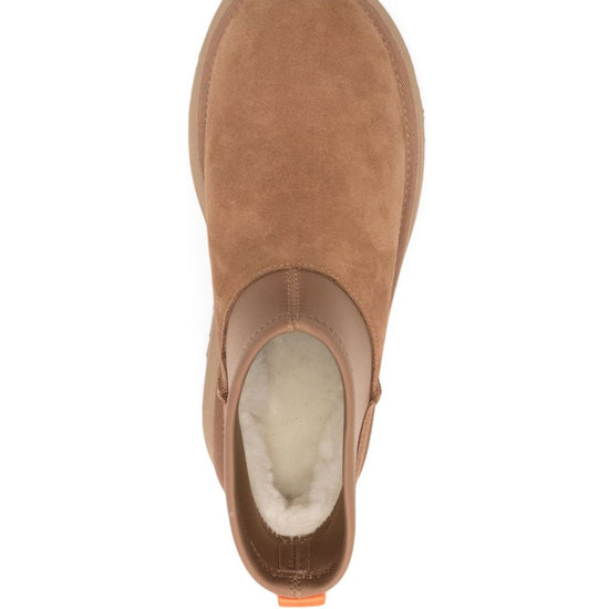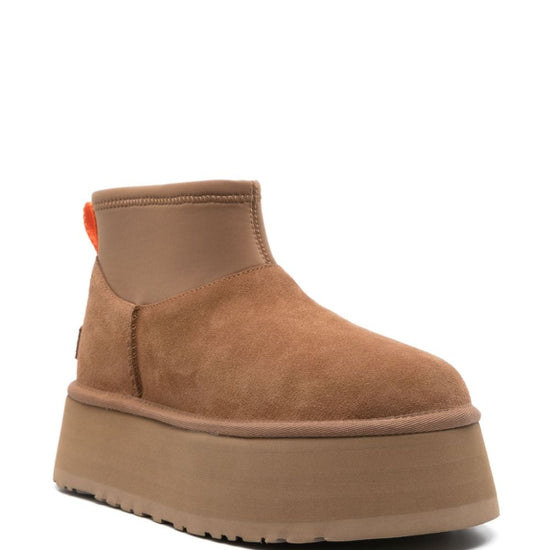 Chestnut brown calf suede branded heel counter pull-tab at the heel ankle-length round toe slip-on style wool-blend lining flatform sole classic mini dipper size and fit - circumference: 22.0 centimetres. heel: 5.0 centimetres. platform: 5.0 centimetres.