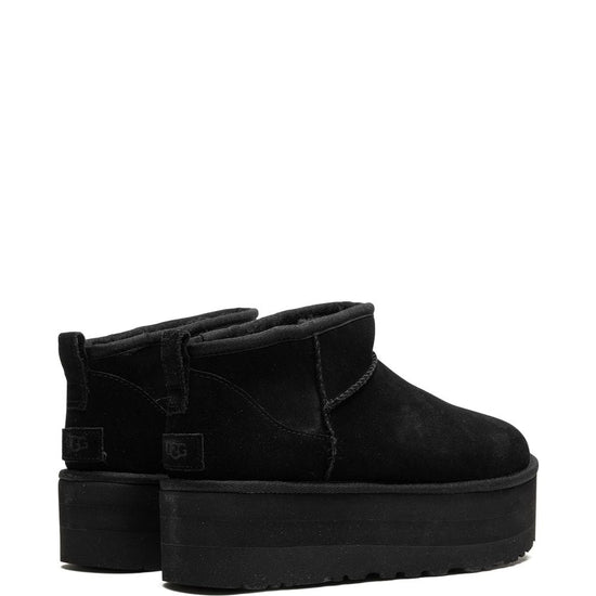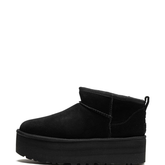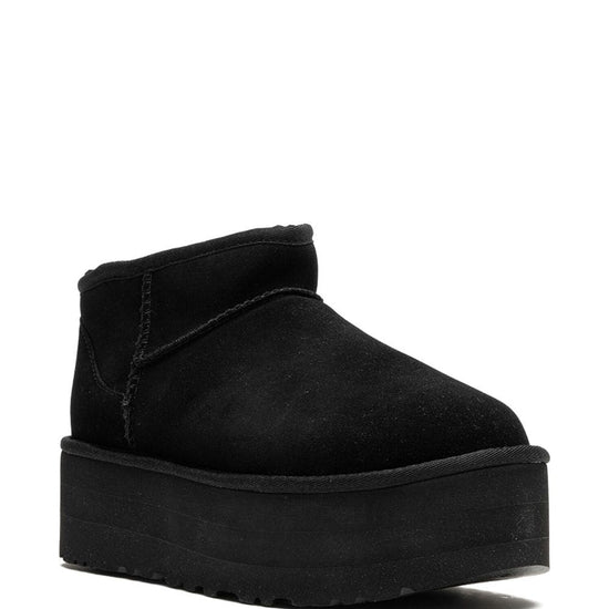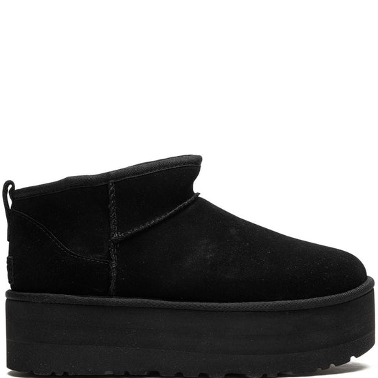 Black suede logo patch to the rear slip-on style ankle-length round toe platform sole classic ultra mini platform boots size and fit - circumference: 31.001 centimetres. heel: 5.499 centimetres. height: 8.89 centimetres. platform: 5.08 centimetres.