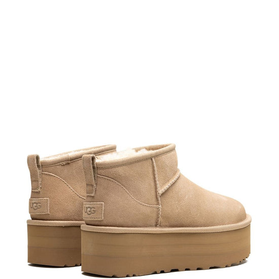 Sand beige suede branded heel counter pull-tab at the heel round toe flatform sole signature uggplush™ lining these styles are supplied by a premium and authenticated sneaker marketplace. stocking only the most sought-after footwear, they source and curate some of the most hard to find sneakers from around the world. classic ultra mini platform boots