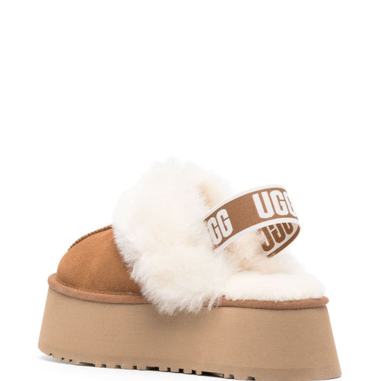 Camel brown calf suede shearling trim round toe elasticated slingback strap slip-on style shearling lining branded insole eva midsole platform sole funkette slippers