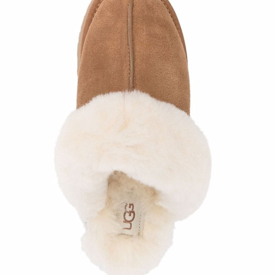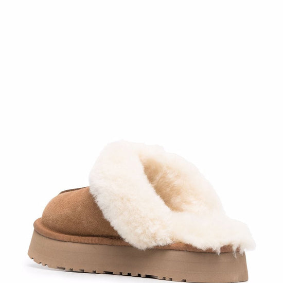 Chestnut brown sheepskin suede slip-on style debossed logo branded insole platform sole disquette slippers size and fit - heel: 5.0 centimetres. platform: 4.0 centimetres.