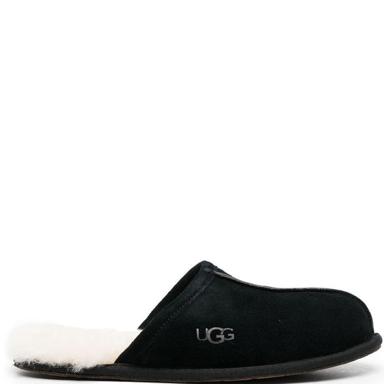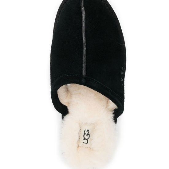 Sand brown suede slip-on style round toe shearling lining branded insole scuff slippers