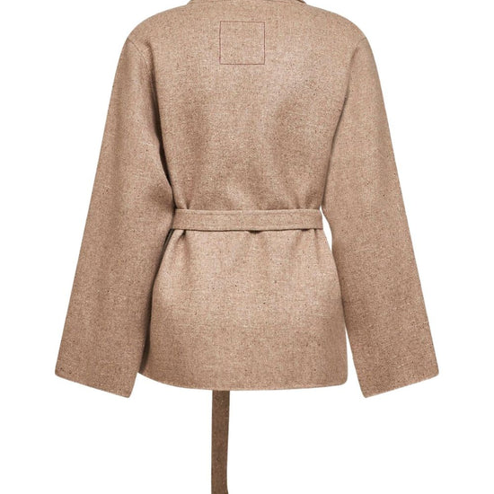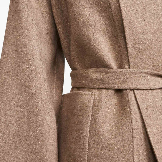 Brown open front shawl collar long sleeves dropped shoulders patch pockets belted waist wool blend jacket