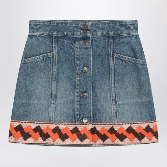 Valentino mini skirt in faded blue cotton denim, characterized by a high waist, front button closure, two side pockets, and contrasting jacquard trim. size and fit - model wears size 40 it model measurements: height: 180 cm chest: 85 cm waist: 66 cm hips: 89 cm
